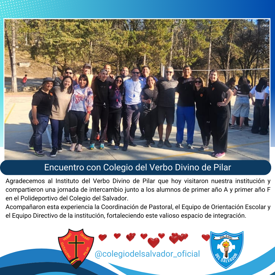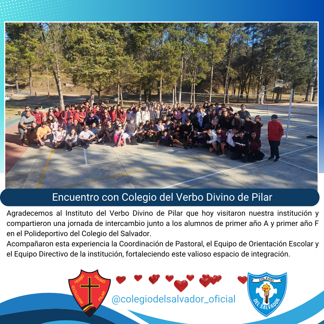 Queremos saludar a los estudiantes del Instituto del Verbo Divino de Pilar, Bs. As., que hoy visitaron nuestra institución y compartieron una jornada de intercambio junto a los alumnos de primer año A y primer año F en el Polideportivo del Colegio del Salvador.