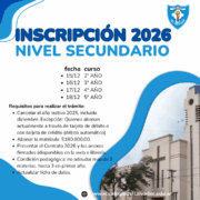 Compartimos con ustedes que, Primer año se inscribe los días 26 y 27/11, y a partir del día 15 de diciembre de 2025, se inicia la Inscripción de estudiantes del Colegio para el Ciclo Lectivo 2026. 2º a 5º año únicamente